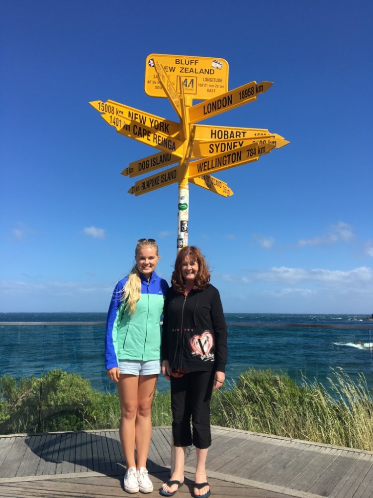 Mum and I at Bluff signpost 2017