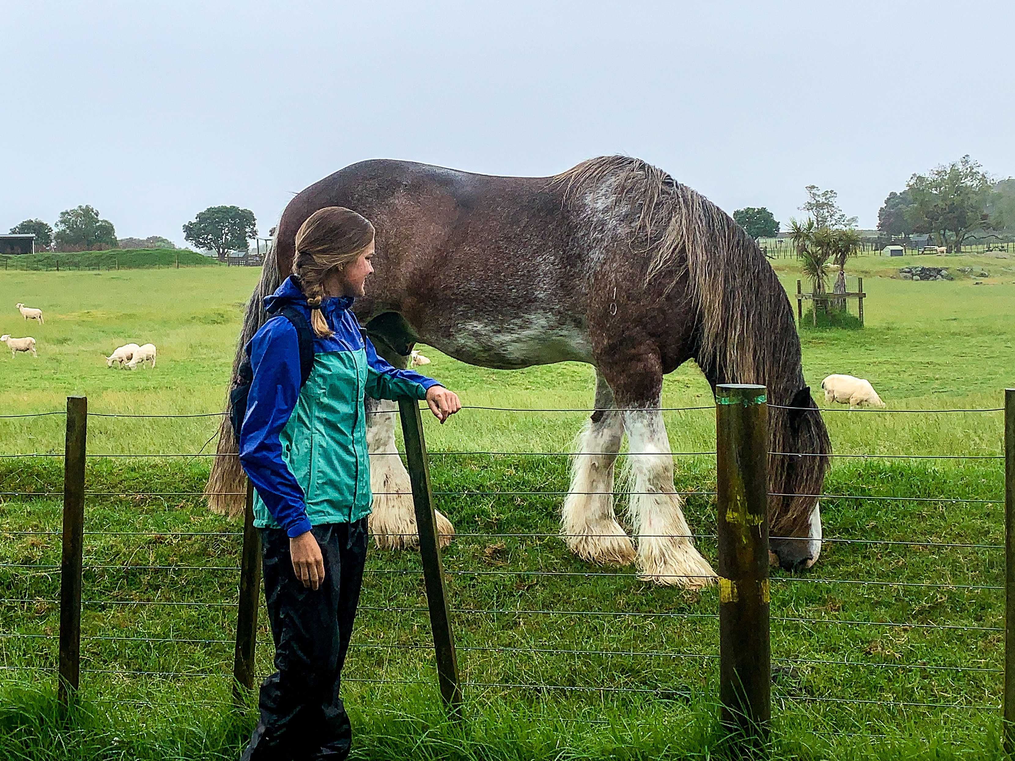 The next day is the longest I have walked on trail so far at 39km from Ambury Farm to the end of Papakura. If I thought it had rained the previous day then this was a monsoon. Cyclone Rubys storm had made her presence known to the occupants of JAFA land. Never did the rain ease and my waterproof clothing really got tested. Turns out nothing that has a hole big enough to fit your head through is really that waterproof. But to make the whole day worth being saturated and looking like a drowned rat I got to see my childhood favourites. As a kid I used to visit Ambury Farm a lot to see the 2 Clydesdale horses. They’re the coolest of the horse breeds incase you’re wondering and at various points in my life I have visited them when I was feeling happy, sad, confused, whatever and they always cheered me up. Well today was no exception. The horses were on full display chewing grass in the paddock and me in my rain coat and rain pants couldn’t have been happier to see them 🙂