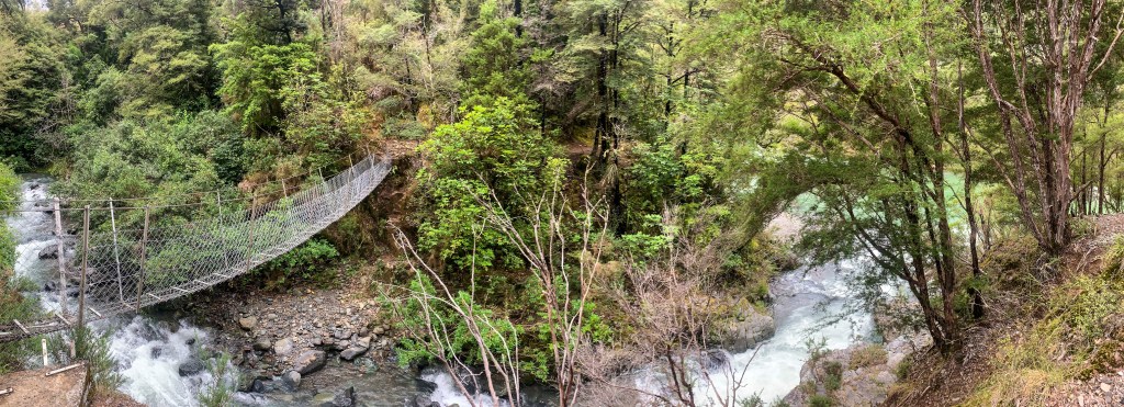 The initial trot involved a farm road which as the rain poured down developed rock waterfalls and flooding, all while we chatted about what to eat first that evening to lighten the bags. Sadly this distracted us to the first wasp attack, sneakily landing on N.Ds pack while we took a break he was painfully greeted with a sting as the bag went back on. 😦 The remainder of the track was on a hiking trail towards Captain Creek and fortunately uneventful with many fun swing bridge crossings.