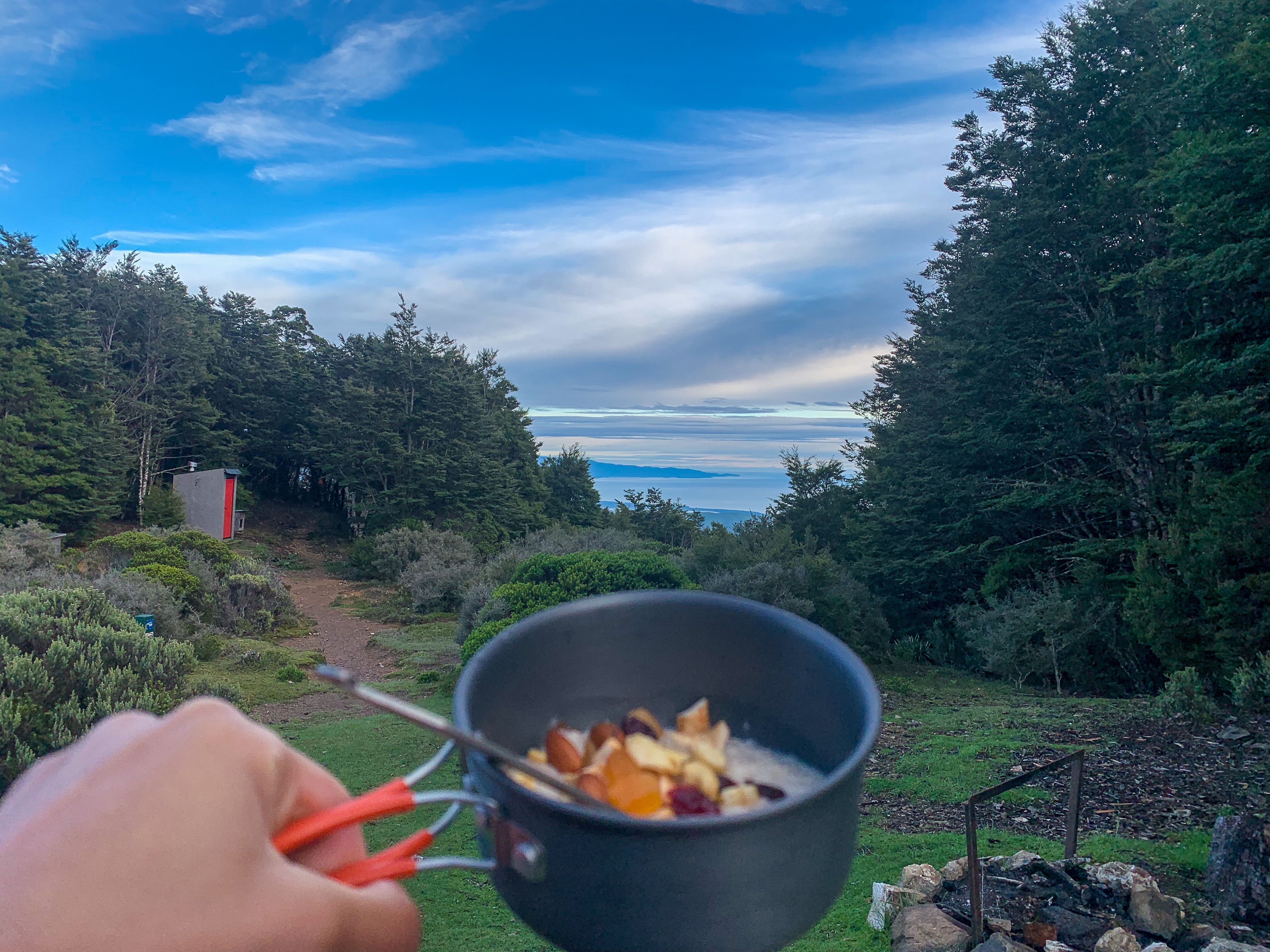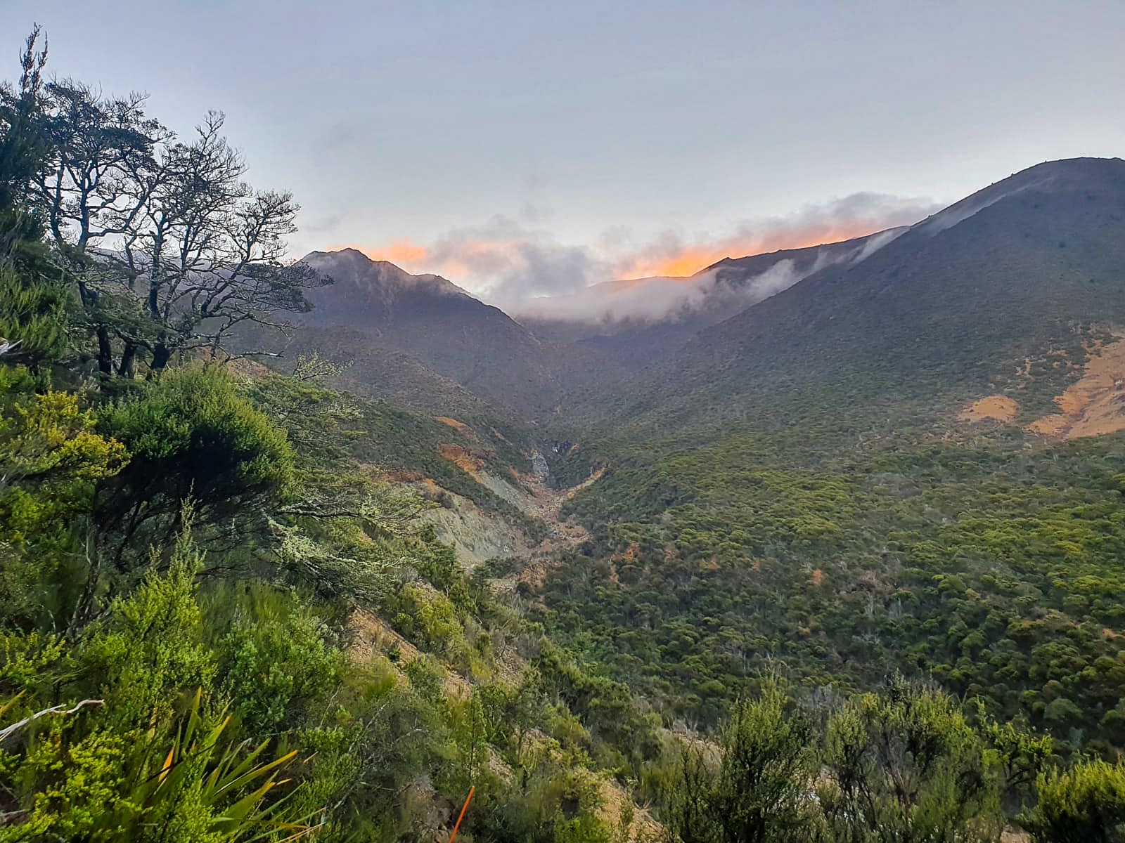 The third day we crossed from the Pelorus River section to the Richmond Ranges; but not without traversing multiple slips, fallen trees, high river detours, Browning Hut and Hackett Hut first. While on this track we caught glimpses of Nelson city below and waved to Jeni and Gary who would be our delightful ‘trail angels’ at the end of the week. From Hackett to Starveall Hut we crossed Hackett and Weka Creek multiple times, each time hoping it was the last as we would ‘submarine’ our shoes, adopt a wide stance, unclip the bag straps and waddle across. Fortunately the river wasn’t too forceful and we safely navigated across 9-10 crossings, ranging from mid-thigh to waist deep. Little did we know it’s normally only ankle deep this time of year. On making it to the hut we sadly had no view but did get reception which N.D took full advantage of to watch Israel destroy Whittaker while I enjoyed one of my favourite dinners on trail… potatoe and gravy 😛