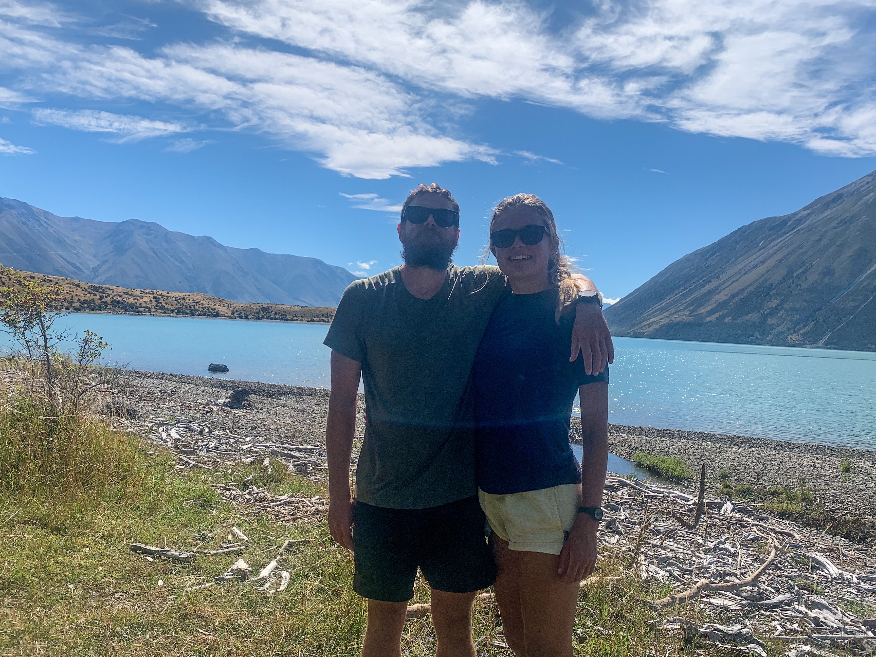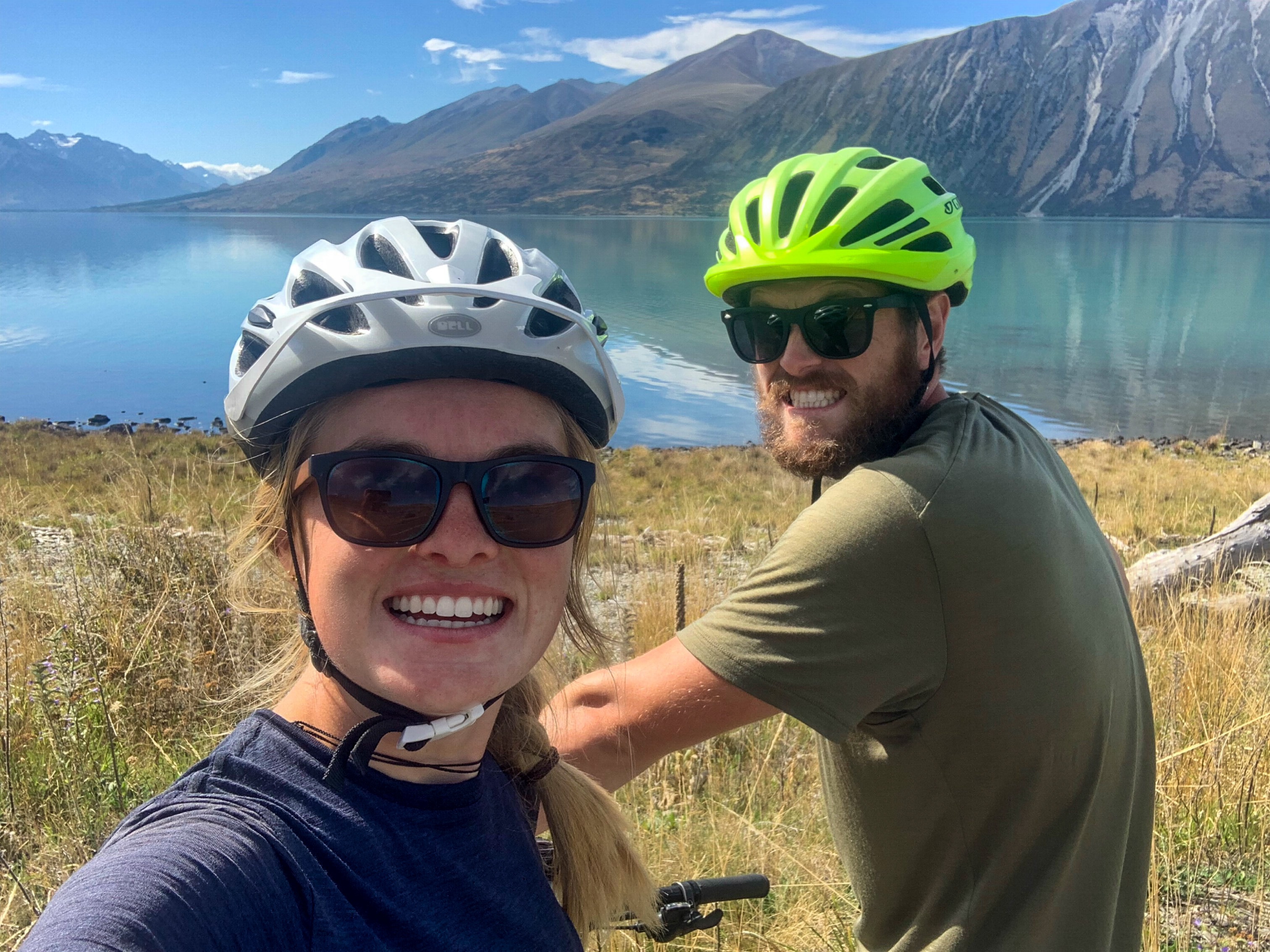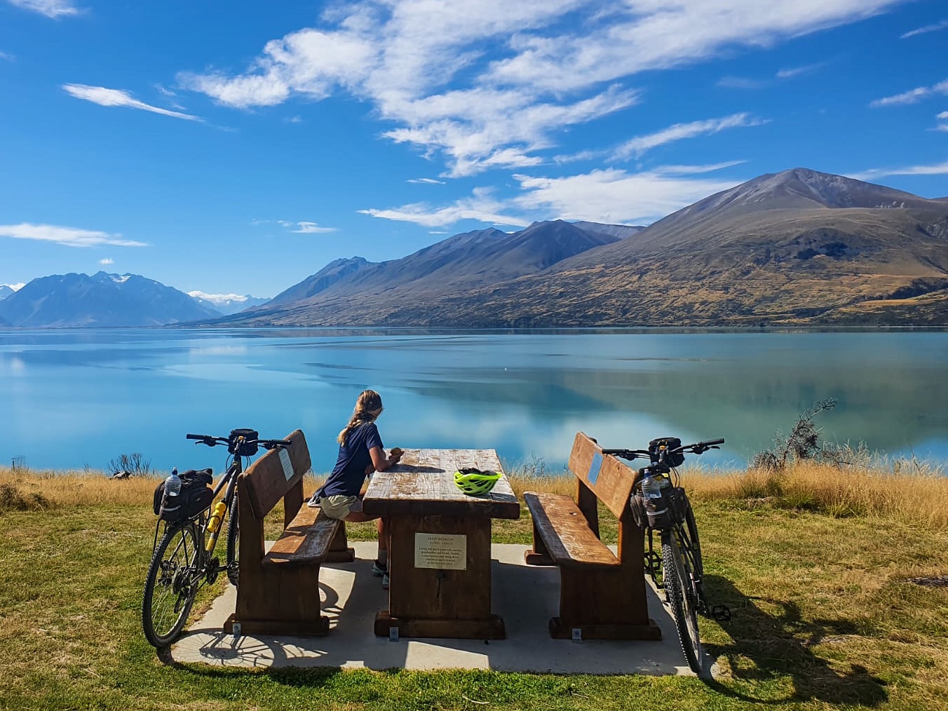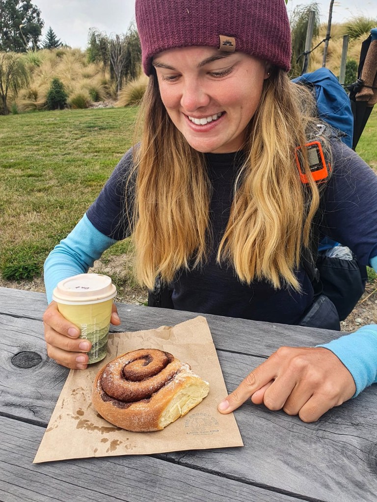 The route from Lake Tekapo to Lake Ohau follows the Alps to Ocean cycle trail. This trail involves cycling alongside canals from Tekapo to Lake Pukaki, through Twizel, to Lake Ruataniwhai and finally Lake Ohau. Not only was this scenically stunning but cycling meant we didn’t have sweaty backs from our packs, we could stretch our arms and legs while still getting the kilometres in and we passed through towns meaning more coffee and snacks. I could really get on board with this cycling thing. 😉 Oh and incase your wondering yes the cinnamon bun was delicious, the views of Mt Cook weren’t half bad either!