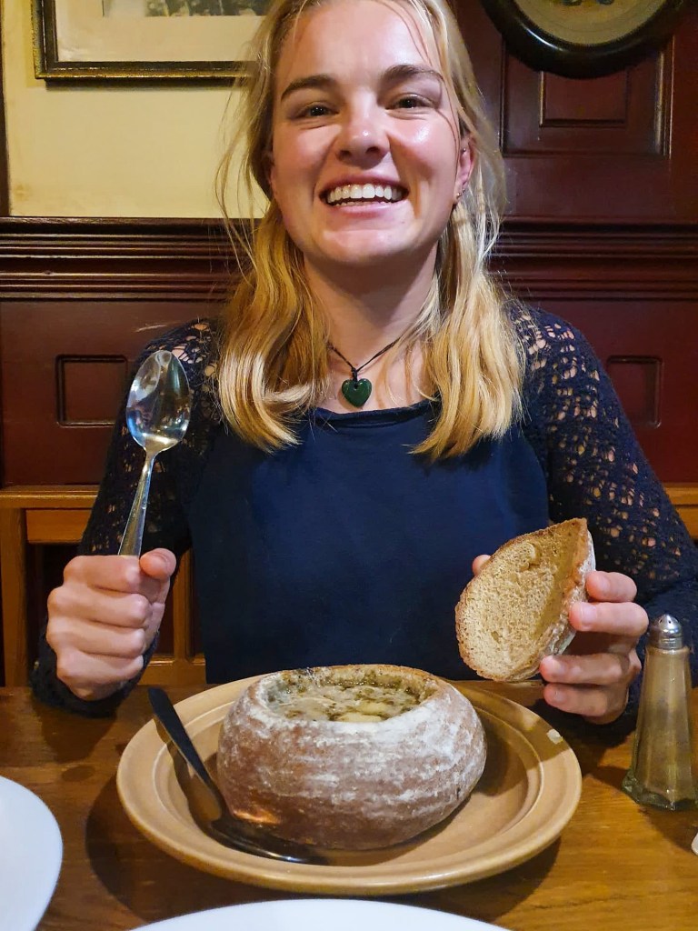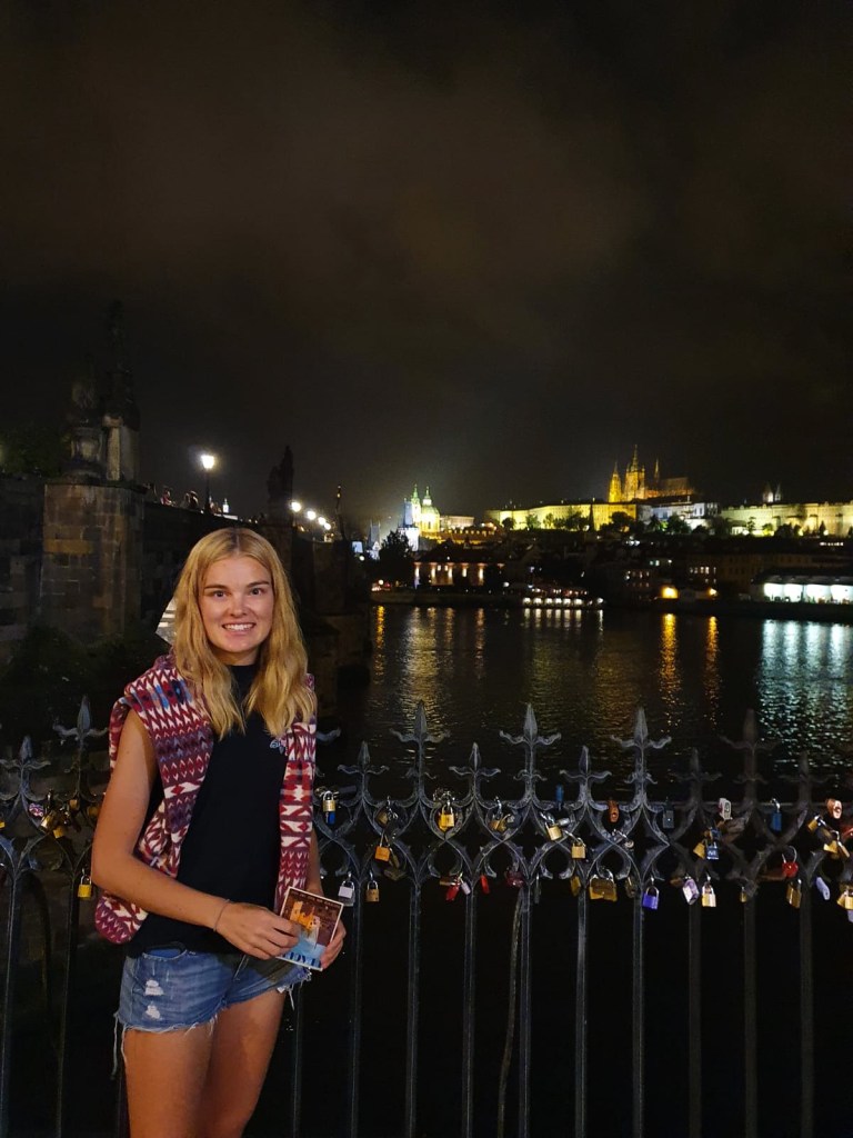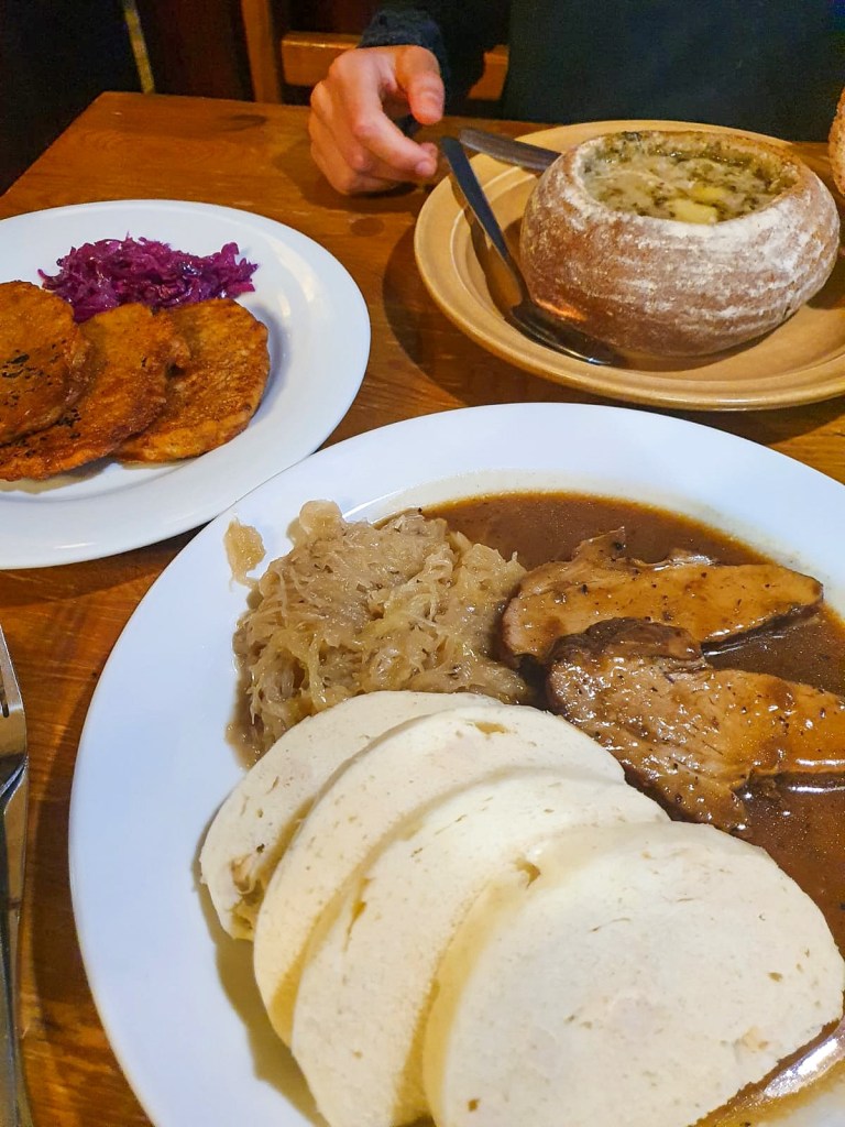 That evening we tried a variety of traditional Czechia food including ฤesneฤka (garlic soup), knedlรญky (dumplings) and vepลo knedlo zelo (roasted pork) before ending the night admiring the illuminated city skyline while floating on a barge. ๐