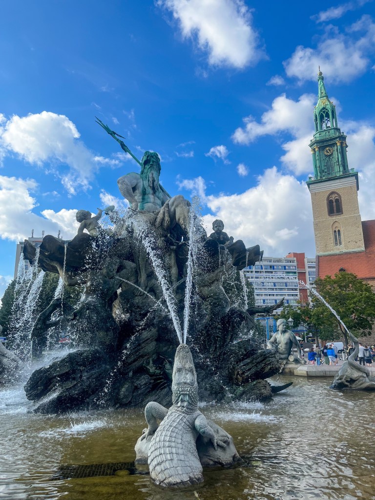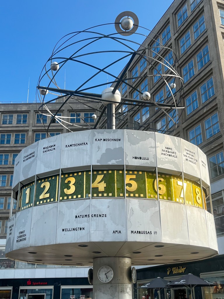 - Alexanderplatz containing St. Marienkirche (St. Mary’s Church), Neptunbrunnen (fountain), Berliner Fernsehturm; 368m tall and the Weltzeituhr (World Time Clock and of course I found New Zealand on it) ๐